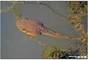 고막의 주위에 검은색의 가로무늬가 있고, 콧등에 점무늬가 있다. 배면에는 회색의 구름무늬가 있다.