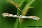 앞날개의 무늬는 앞의 반은 명료하고, 제2주맥(Cu2) 부근의 백색 부분에서는 소실되어 있다.
