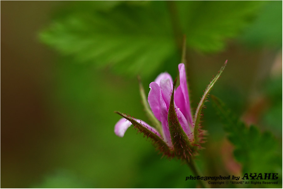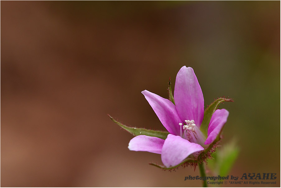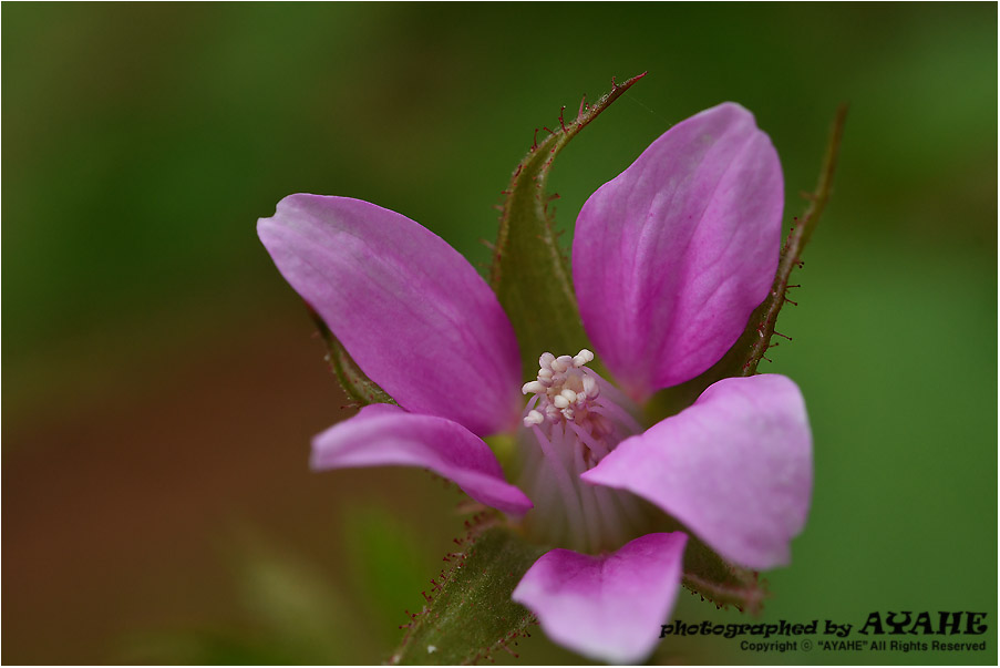 가시털이 있고 꽃잎은 타원형이며, 길이 1cm로서, 꽃받침 보다 길고, 연한 분홍색이다.